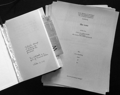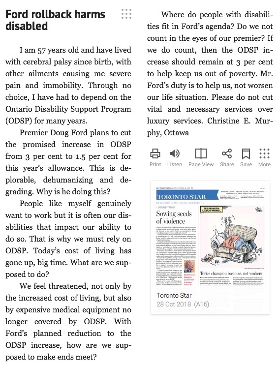 MINIMAL ACTION 3: letters from disability+poverty go to MPPs A MINIMAL ACTION package was delivered at Queen's Park by claude wittmann, on October 30th, 2018. claude gave it directly to NDP MPP critic for social services Lisa Gretzky and her assistant Sara King. ![]() package for MPP Lisa Gretzky ---- what is MINIMAL ACTION 3? MINIMAL ACTION 3 invites individuals with lived experience of disability+poverty and allies to write a letter to one or several Members of Provincial Parliament (MPPs), while positioning themselves in relationship with the reorganization of social assistance currently happening behind doors and without input from the community. Since this process will end on November 8, 2018 with an official announcement, MINIMAL ACTION 3 invites you to write your letter before that day. ("background" information below). MINIMAL ACTION 3 is a collaboration between a previous action named MINIMAL ACTION 2 and faculty members, Eliza Chandler, Esther Ignani, Kimberlee Collins, Fiona Cheuk, Loree Erickson, and students at the Ryerson School of Disability Studies. |